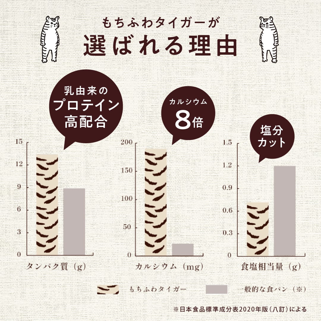 乳由来のたんぱく質(プロテイン)を多く配合しているため、たんぱく質を効率良く摂取できる点が最大の特徴です。また、一般的な食パン(※)に比べて、カルシウムを8倍以上含み、食塩相当量は大幅に少ないため、健康な身体づくりを目指す方、塩分摂取量に気をつけている方にも、日常的にお召し上がりいただけます。